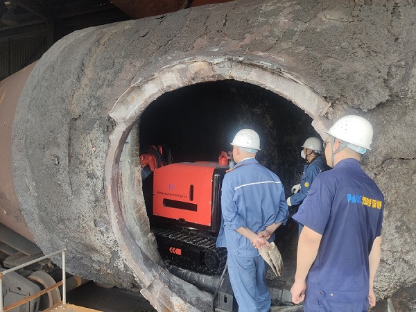 魚雷式鐵水罐,簡稱混鐵車或魚雷罐,是用于盛裝和運(yùn)送鐵水的設(shè)備之一。它在冶金工業(yè)中起著重要的作用。然而,魚雷罐的內(nèi)襯耐火材料受到長期運(yùn)行和鐵水、爐渣的嚴(yán)酷化學(xué)侵蝕。在使用周期中,間隙式作業(yè)引起的溫度波動(dòng)和熱應(yīng)力作用也會(huì)加劇耐火材料的劣化和損壞。因此,定時(shí)更換耐火材料對于保持工作效率至關(guān)重要。傳統(tǒng)的耐火材料更換工作需要人工進(jìn)行,這不僅費(fèi)時(shí)費(fèi)力,而且存在一定的安全風(fēng)險(xiǎn)。然而,現(xiàn)代技術(shù)的發(fā)展為這一問題提供了全新的解決方案——破拆機(jī)器人。