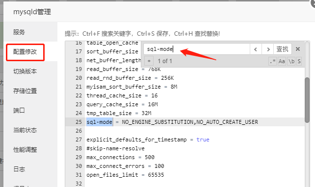 2.點(diǎn)擊配置修改,查找sql-mode或sql_mode (可使用Ctrl+F快捷查找)