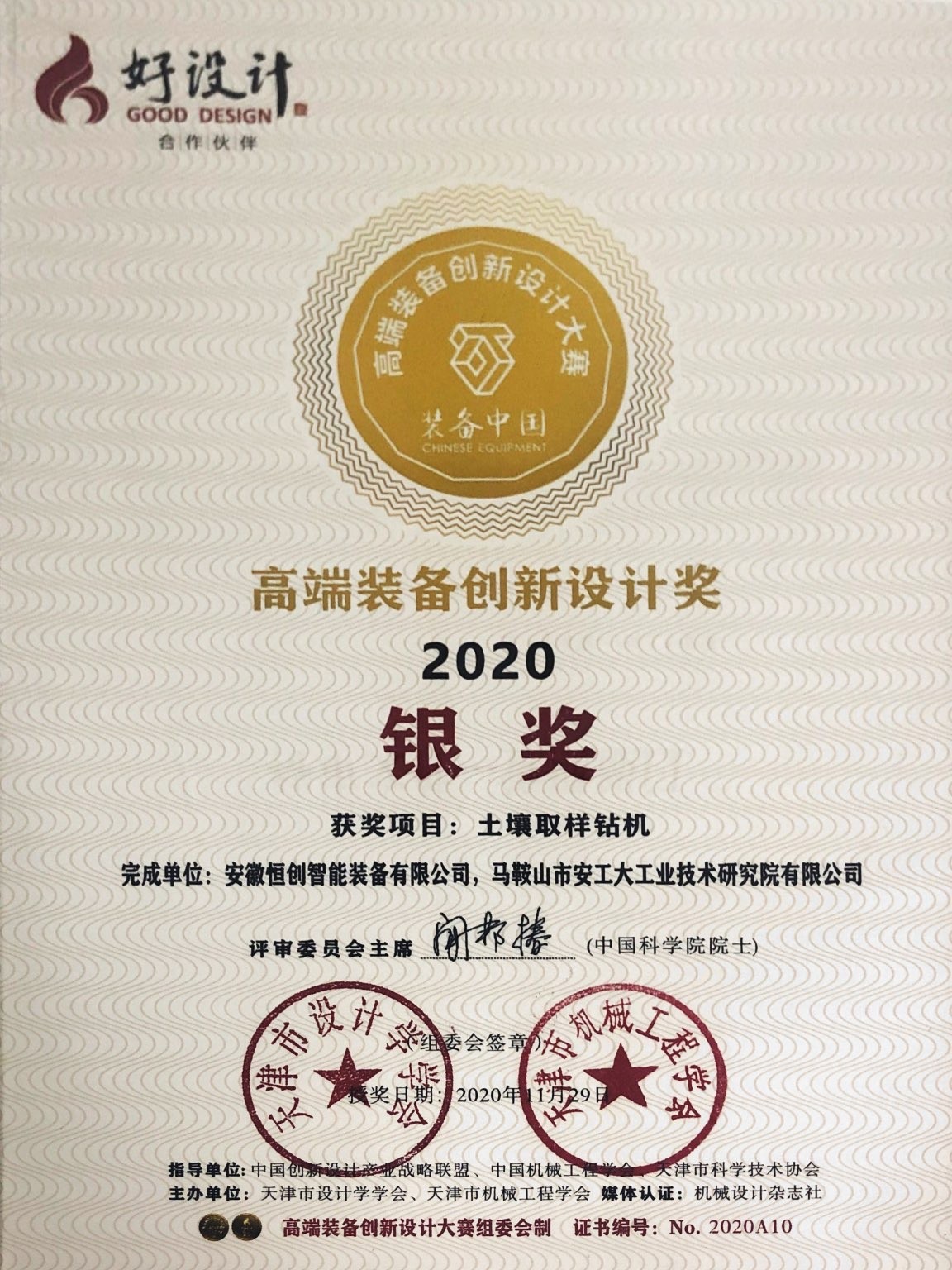 2020中國創(chuàng)新設(shè)計大會天津峰會@云峰會暨“好設(shè)計”合作伙伴“裝備中國”2020年高端裝備創(chuàng)新設(shè)計大賽頒獎典禮及2020“華北地區(qū)好設(shè)計”獎頒獎典禮于2020年11月29日在天津市河北區(qū)隆重召開。安徽恒創(chuàng)智能裝備有限公司與馬鞍山市安工大工業(yè)技術(shù)研究院有限公司共同設(shè)計的土壤取樣鉆機榮獲本次高端裝備創(chuàng)新設(shè)計獎銀獎。